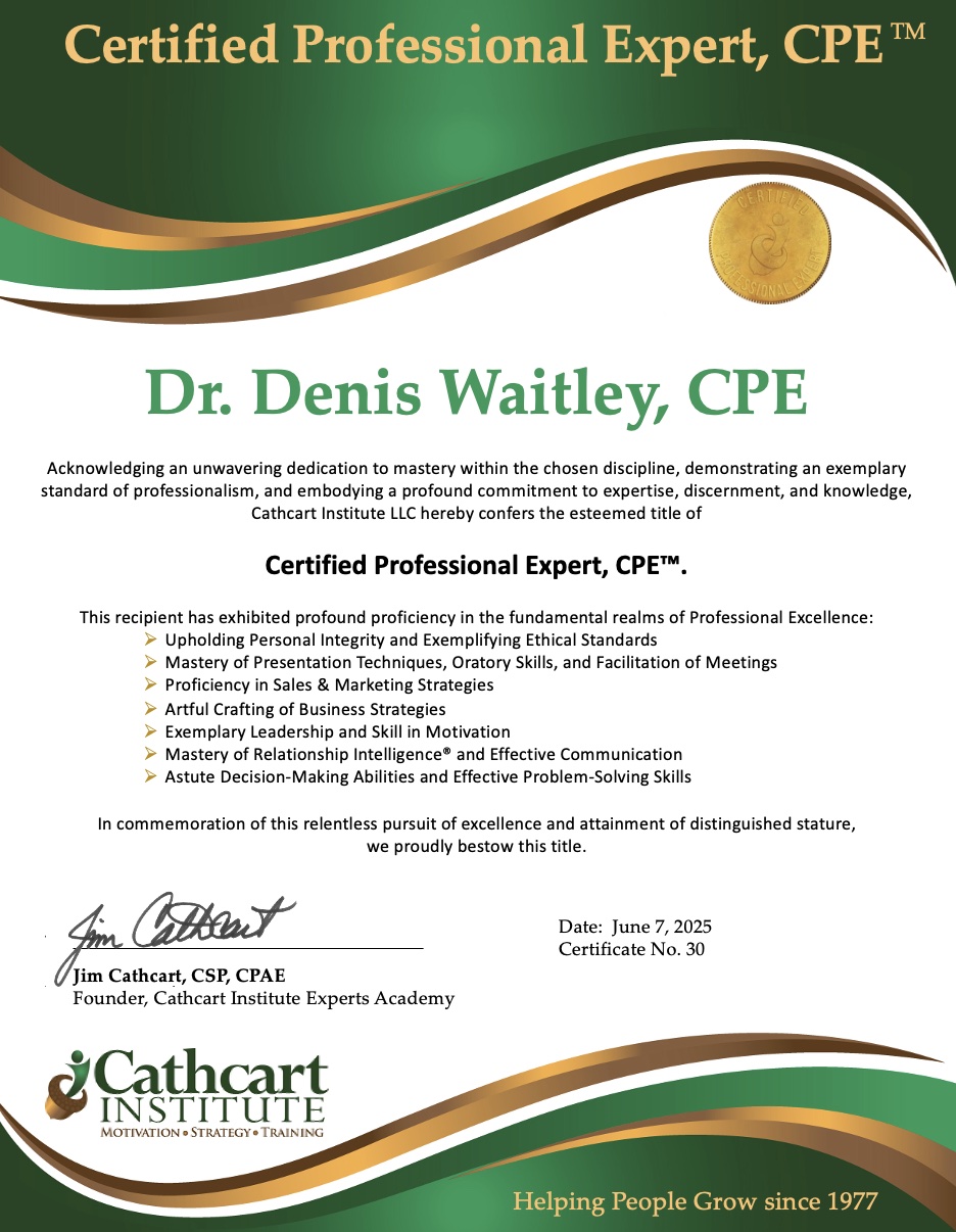 Cathcart Institute announces the first ever posthumous Certified Professional Expert, CPE #30, Dr. Denis Waitley.