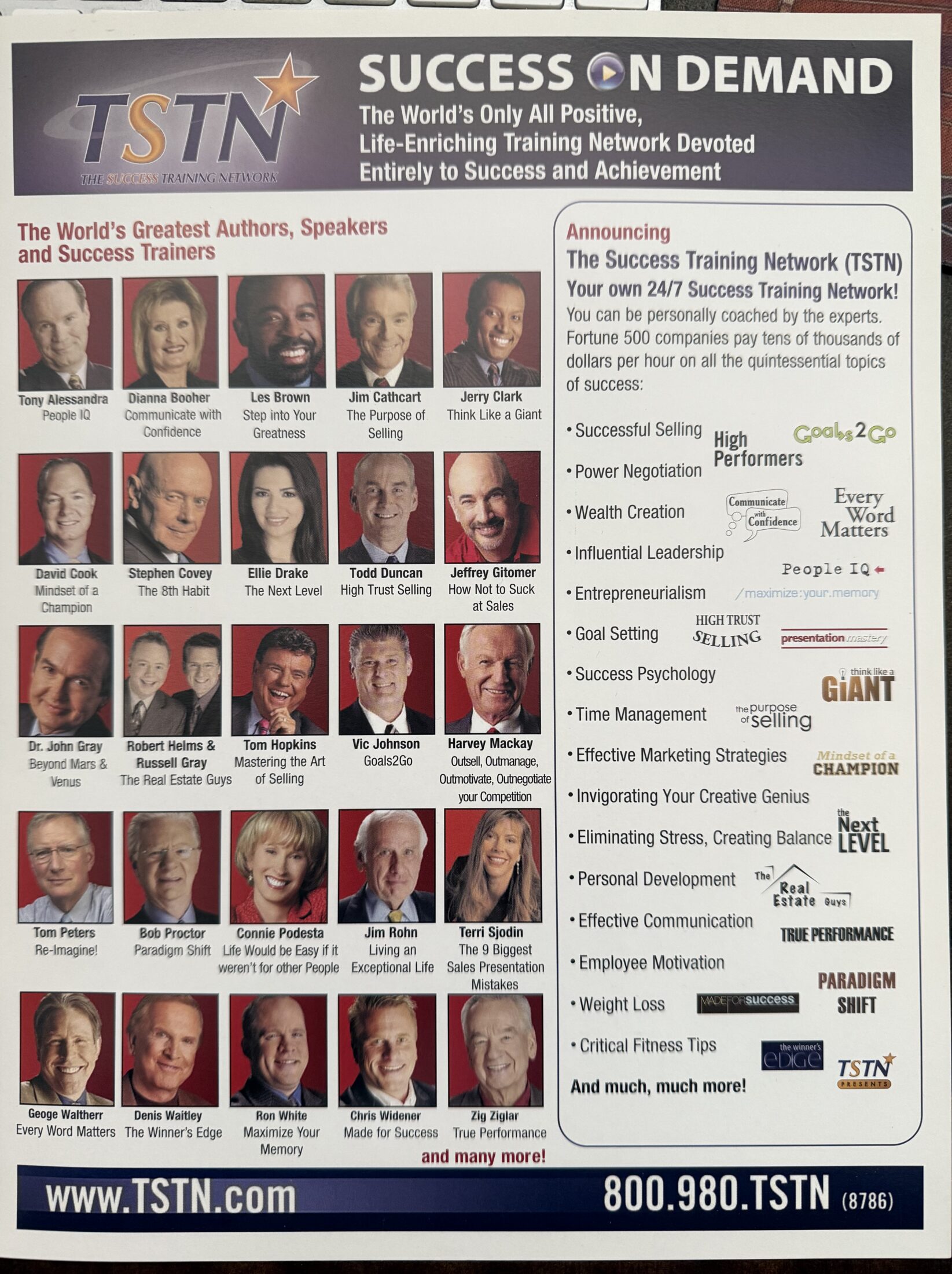 Art LinkletterBill BachrachBob DonnellBob ProctorBrian tracyCavett RobertChris WidenerConnie PodestaDarren LaCroixDarryl DavisDenis WaitleyDon HutsonEarl NightingaleErik SwansonGeorge WaltherHarvey MackayJeffrey GitomerJim RohnJohn GrayKaren JacobsonMentor & AdvisorNorman Vincent PealeOral Roberts UniversityRamon RayRobert HenryRobert SchullerRon WhiteStephen CoveyTerri SjodinTodd DuncanTom HopkinsTom PetersTony AlessandraTy BoydZig Ziglar
