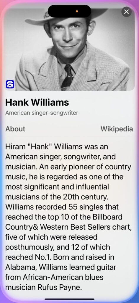 Hank Williams was even more influential. He is often referred to as “Pappy” (grand father) by today’s Country Music stars. Hank was a gifted songwriter whose music is still sung today. He died at age 29.